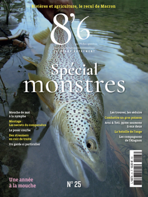 Dans ce vingt-cinquième numéro, 8’6 vous fait découvrir la belle histoire de trois adolescents amoureux de leur rivière qu’ils défendent au sein de l’association Vive l’Alagnon qu’ils ont créé il y a plus de vingt ans . Nous découvrons comment et pourquoi il est parfois nécessaire de pêcher avec des nymphes de mouche de mai. Etudions un montage très commun aux U.S.A mais peu répandu en Europe, le comparadun. Apprenons à contourner le poser courbe. Comment combattre le poisson de sa vie sans faire d’erreur. Réaliser une année entière à la mouche pour le plein d’émotions.